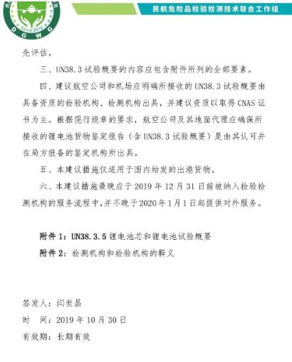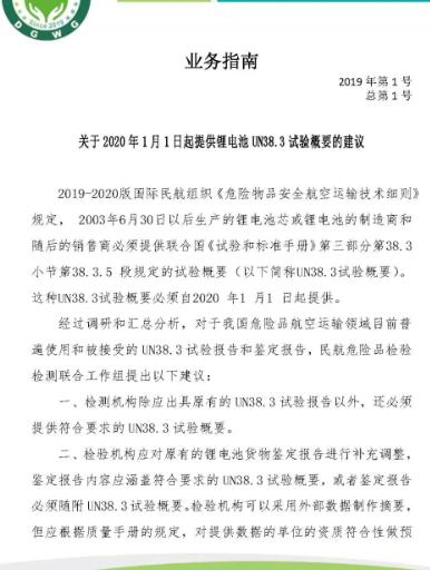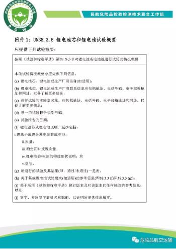 2019-2020版國際民航組織《危險物品安全航空運輸技術細則》規(guī)定,2003年6月30日以后生產(chǎn)的鋰電池芯或者鋰電池的制造商和隨后的銷售商必須提供聯(lián)合國《試驗和標準手冊》第三部分第38.3小節(jié)第38.3.5段規(guī)定的試驗概要(以下簡稱UN38.3試驗概要)。